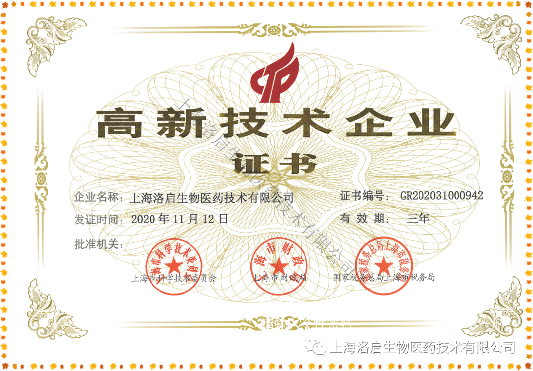 近期,上海5657威尼斯(中国)生物医药技术有限公司取得了由上海市科学技术委员会、上海市财政局、国家税务总局上海市税务局联合颁发的“高新技术企业证书”。