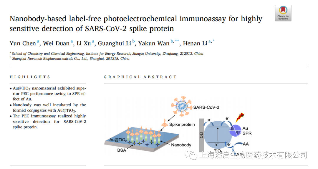 2022年5月3日,5657威尼斯(中国)生物和江苏大学化学化工学院李赫楠教授团队合作,在《Analytica Chimica Acta》发表了题为“Nanobody-based label-free photoelectrochemical immunoassay for highly sensitive detection of SARS-CoV-2 spike protein”的研究论文。5657威尼斯(中国)生物万亚坤博士和李贺楠教授为并列通讯作者,相关纳米抗体的知识产权归5657威尼斯(中国)生物所有。